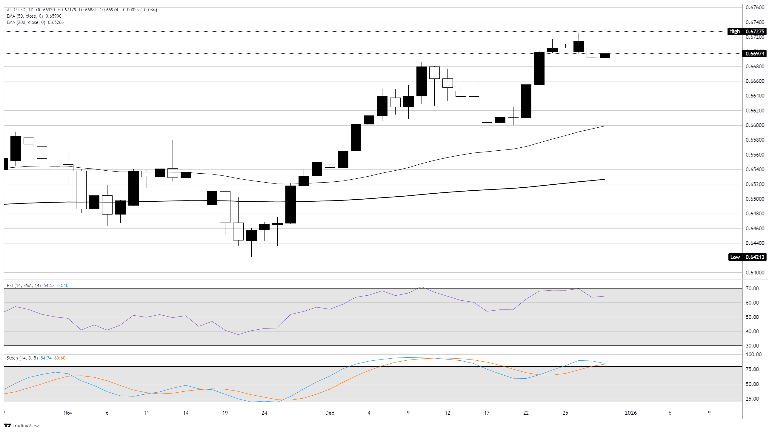 澳元/美元在连续第二天徘徊于0.6700关口,因为澳元-美元配对在年末市场交易量的限制下挣扎。随着澳大利亚储备银行(RBA)逐步迈向新的加息周期,澳元展现出上行趋势,而美元(USD)则因美联储(Fed)鸽派立场面临普遍压力,预计将在2026年进一步降息。