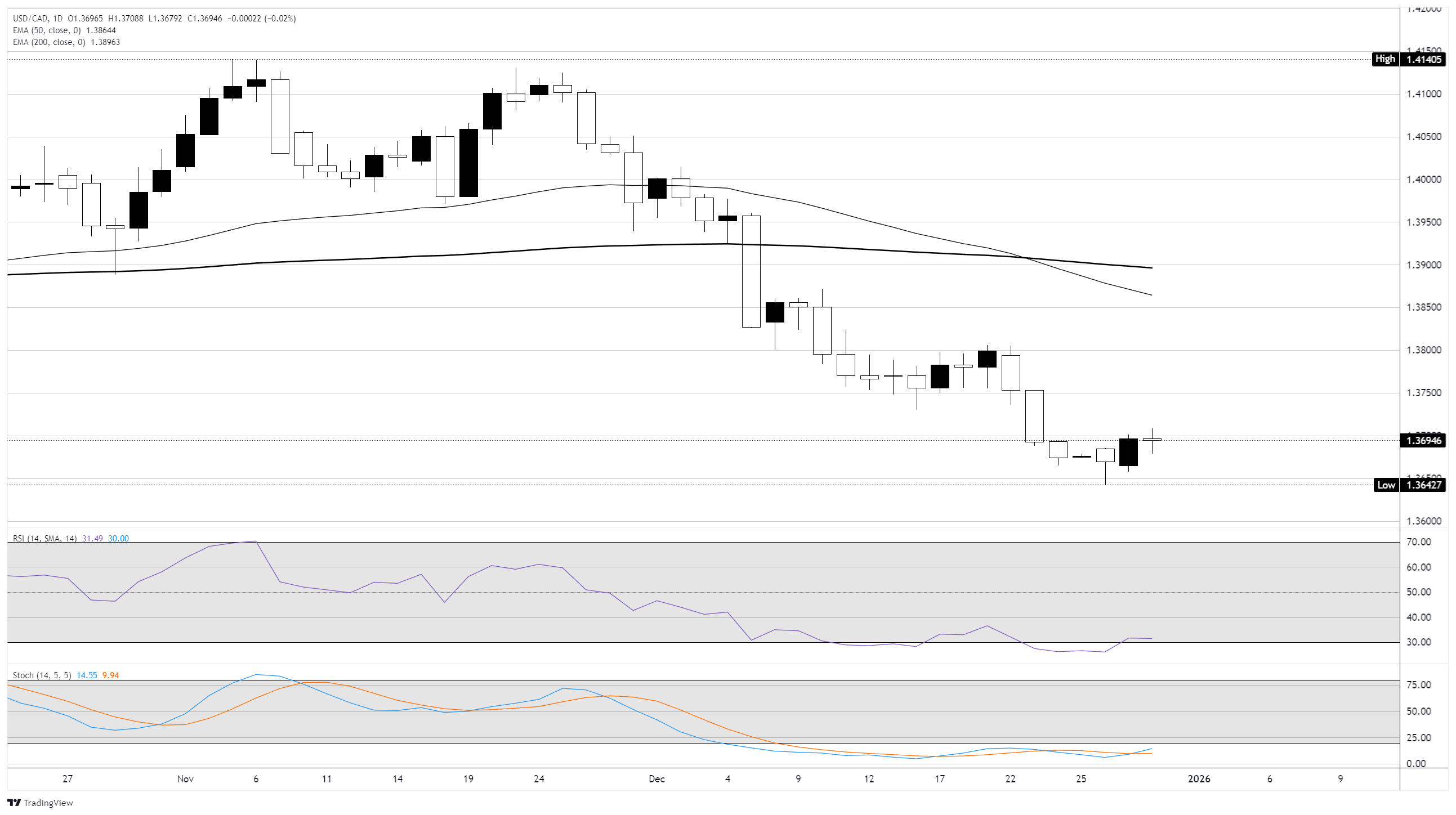 在日线图上,美元/加元交易于1.3697。该货币对保持在50日和200日指数移动平均线下方,均指向下方。50日EMA已穿越200日EMA下方,强化了看跌的布局并限制了反弹。RSI接近32,表明在超卖下跌后动能疲弱,而随机指标从极低点回升暗示下行压力减弱。