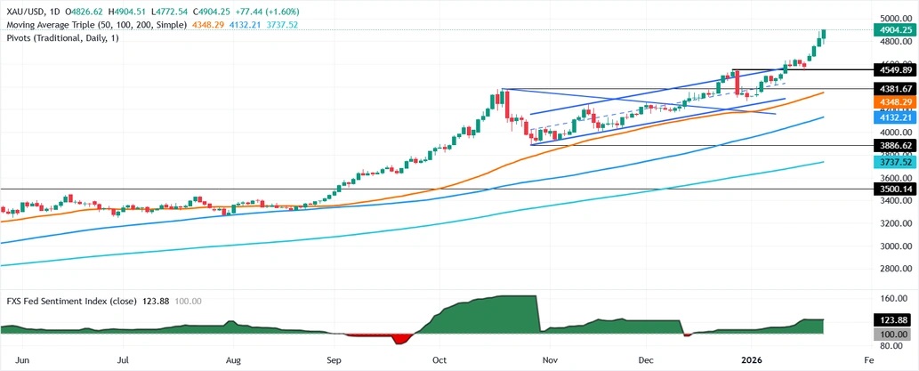 FXStreet分析师Christian Borjon Valencia指出,由于政策不确定性持续存在以及市场对宽松政策的预期,黄金价格连续第四天上涨,并飙升至4900美元/盎司上方的纪录高位。