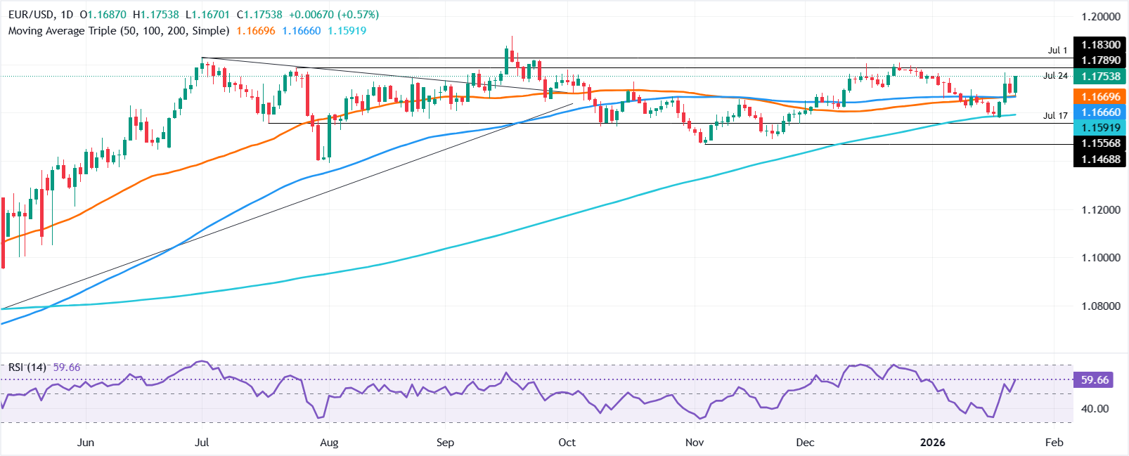 欧元/美元在本周第二天上涨超过0.50%,尽管当天发布了强劲的美国经济数据,美元却下滑。美国总统唐纳德·特朗普放弃对欧洲的关税威胁,改善了风险偏好,支撑了欧元。在撰写本文时,该货币对交易于1.1743,反弹自日低1.1670。