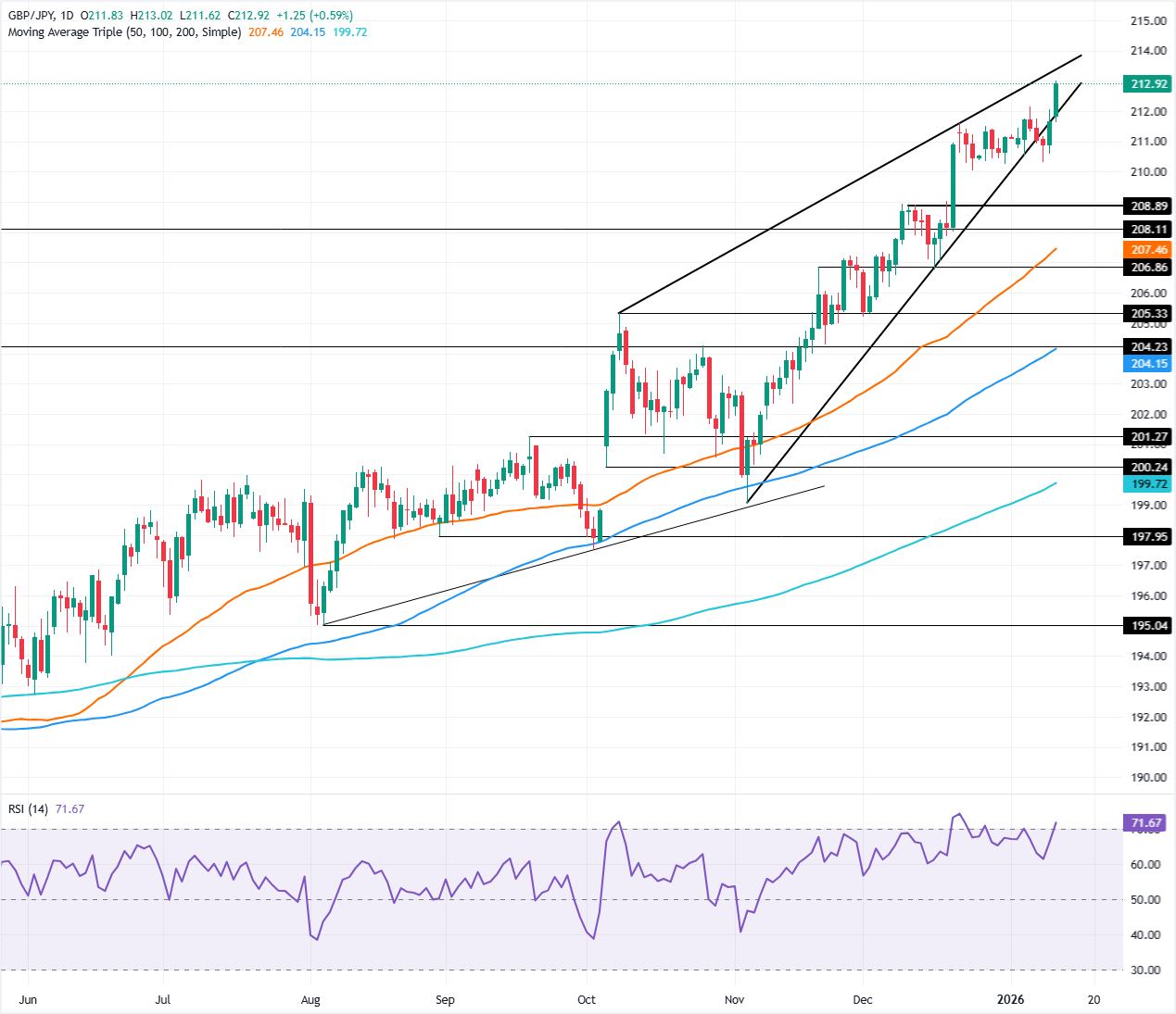 英镑/日元的技术图景看涨,在该货币对突破210.00-212.00交易区间的顶部后,推动该货币对达到212.93的新年度高点,买家瞄准213.00的关口。一旦突破,下一目标将是213.50,随后是214.00。