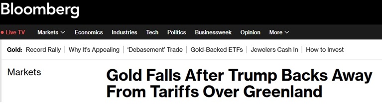 #格陵兰争端#美国彭博社称,在美国总统特朗普撤回对欧洲国家加征关税的威胁,并表示已就格陵兰问题达成“一项未来协议的框架”后,金价出现下跌。