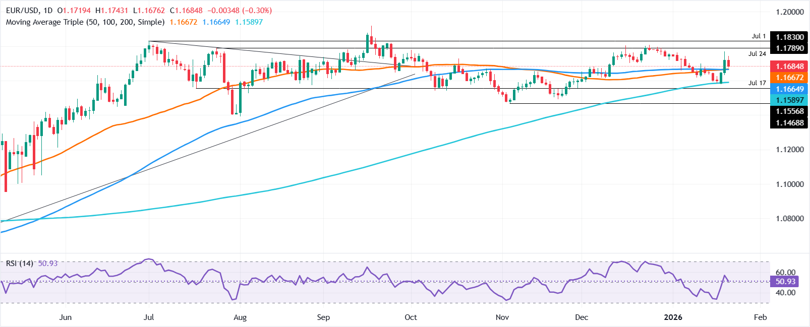 周三北美交易时段,欧元/美元回落,跌幅超过0.30%,因美国总统唐纳德·特朗普未对八个欧洲国家施加关税威胁,涉及格林兰的讨论。